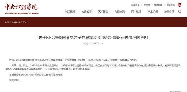 该博主表示已按正规流程向教育主管部门提交举报材料并拿到回执,基于公开可查信息提出三点核心疑问: 第一,关于林某霏的资格合规性。 中戏“新疆班”是扶持新疆少数民族艺术人才的专项计划,而公开信息显示林傲霏为吉林籍、汉族,他有资格进入吗?想请教该资格认定的具体依据。 第二,关于户籍与学籍。 这类专项政策通常对考生的新疆户籍或学籍有明确要求,但根据闫学晶此前公开表述,其本人为北京户口,儿子主要在北京成长,是否符合要求? 第三,关于教育公平。 高考公平关乎千万考生,公众人物的子女更受社会关注,希望确认此次录取过程是否完全符合公开的招生政策,避免破坏公平。 “我会等待官方调查结果,第一时间同步进展, 请大家持续关注。”博主强调举报不针对个人,仅为维护教育公平,呼吁相关方或当事人作出清晰说明,并将持续同步官方调查进展。 刚刚,中央戏剧学院发布声明 近日,网络上出现有关演员闫某晶之子林某霏曾就读“中戏新疆班”的信息,引发公众关注与讨论。经核查,现作出如下声明。 林某霏,男,汉族,2012年北京市高中应届毕业, 以户籍地北京生源身份报考我院, 先后参加我院本科招生专业考试和普通高等学校招生全国统一考试,被录取至我院表演系2012级戏剧影视表演普通本科班。2012年我院未招收新疆班,网传信息不属实。 感谢社会各界长期以来对我院办学工作的关注和支持。 特此声明。
